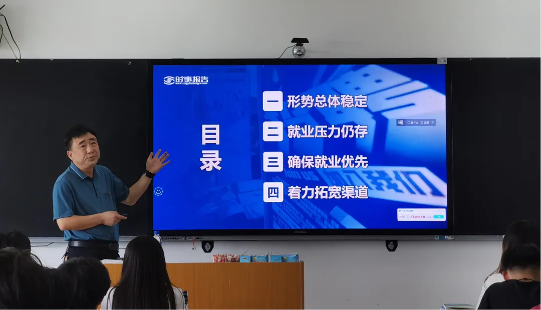 学院党委委员路毅以“当前就业形式与实施就业优先战略”为题给学生们带来系统、深入的讲解。课程伊始,路毅委员详细分析了当前国内外的就业市场状况。他提到,随着经济的快速发展和产业结构的调整,就业市场呈现出多元化的趋势,但同时也面临着一些挑战,如就业结构性矛盾、技能匹配问题以及竞争压力等。接着,路毅深入解读了国家实施就业优先战略的背景和目的。他强调,就业是民生之本,关系到千家万户的幸福和社会的稳定。国家通过制定一系列政策措施,如加大就业培训力度、优化就业服务、鼓励创业创新等,旨在促进就业市场的健康发展,为广大劳动者提供更多的就业机会和更好的就业环境。在讲课中,路毅还结合学院的专业特色和人才培养目标,对学生们提出了具体的建议。他鼓励学生们要树立正确的就业观念,不断提升自己的综合素质和专业技能,积极参与实习实训和社会实践活动,增强自己的就业竞争力。同时,他也提醒学生们要关注国家政策和市场需求的变化,及时调整自己的职业规划和发展方向。