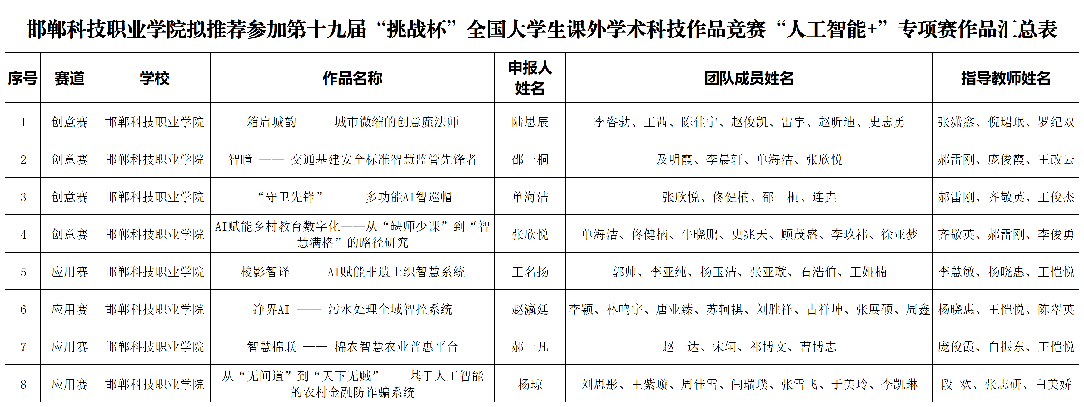 根据《关于开展第十九届“挑战杯”全国大学生课外学术科技作品竞赛的工作提示》的相关要求,我院组织开展第十九届“挑战杯”全国大学生课外学术科技作品竞赛“人工智能+”专项赛工作,综合校内外专家评审意见,现对我院拟推报项目的相关信息进行公示,接受全院师生的监督。
