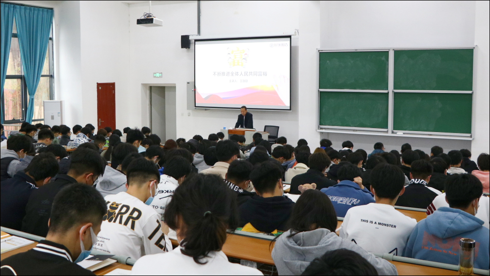 王敬献以《不断推进全体人民共同富裕》为题,以深厚的思想政治理论功底,结合浙江正在开展的共同富裕示范区建设和皇城相府因地制宜探索实现共同富裕的生动实践,从“什么是共同富裕”、“共同富裕的实现途径”以及“共同富裕的未来政策”三个部分,由浅入深的为学生展开一幅中国脱贫攻坚、共同富裕的壮丽画卷。