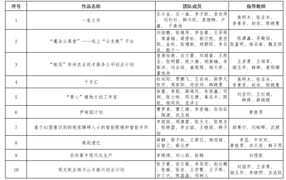 按照《关于举办 2022 年“挑战杯”河北省大学生创业计划竞赛的通知》(冀团联字〔2022〕10 号)要求,根据竞赛章程,职业院校每校项目总数不超过 10 件。截止5月21日我院共收到12项作品参赛,经过专家评审,选出10项作品推报参加2022年“挑战杯”省内竞赛,作品名单如下: