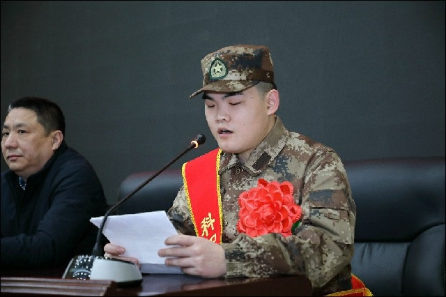 欢送会上,陈龙同学代表全体役前教育参训学生发言,他表示同学们到基地后一定刻苦训练、努力学习;遵守纪律,服从领导,把“吃苦在前,甘愿奉献”的思想牢牢扎根在心中,尽快成长为一名合格的优秀军人,决不辜负学院领导、老师、家长和全体同学们的厚望和期待。